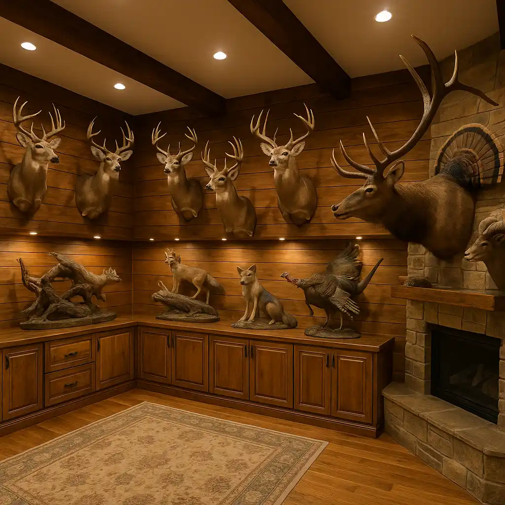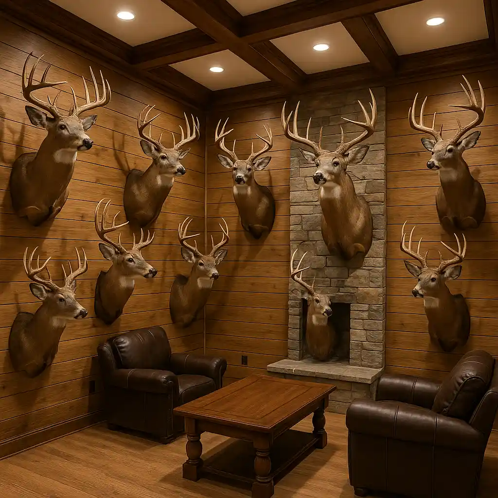 A thoughtful layout is what separates an average trophy room from a memorable one. Begin by measuring your mounts and planning around sightlines. Larger whitetail mounts look best at or slightly above eye level, while smaller trophies can fill side walls or alcoves.